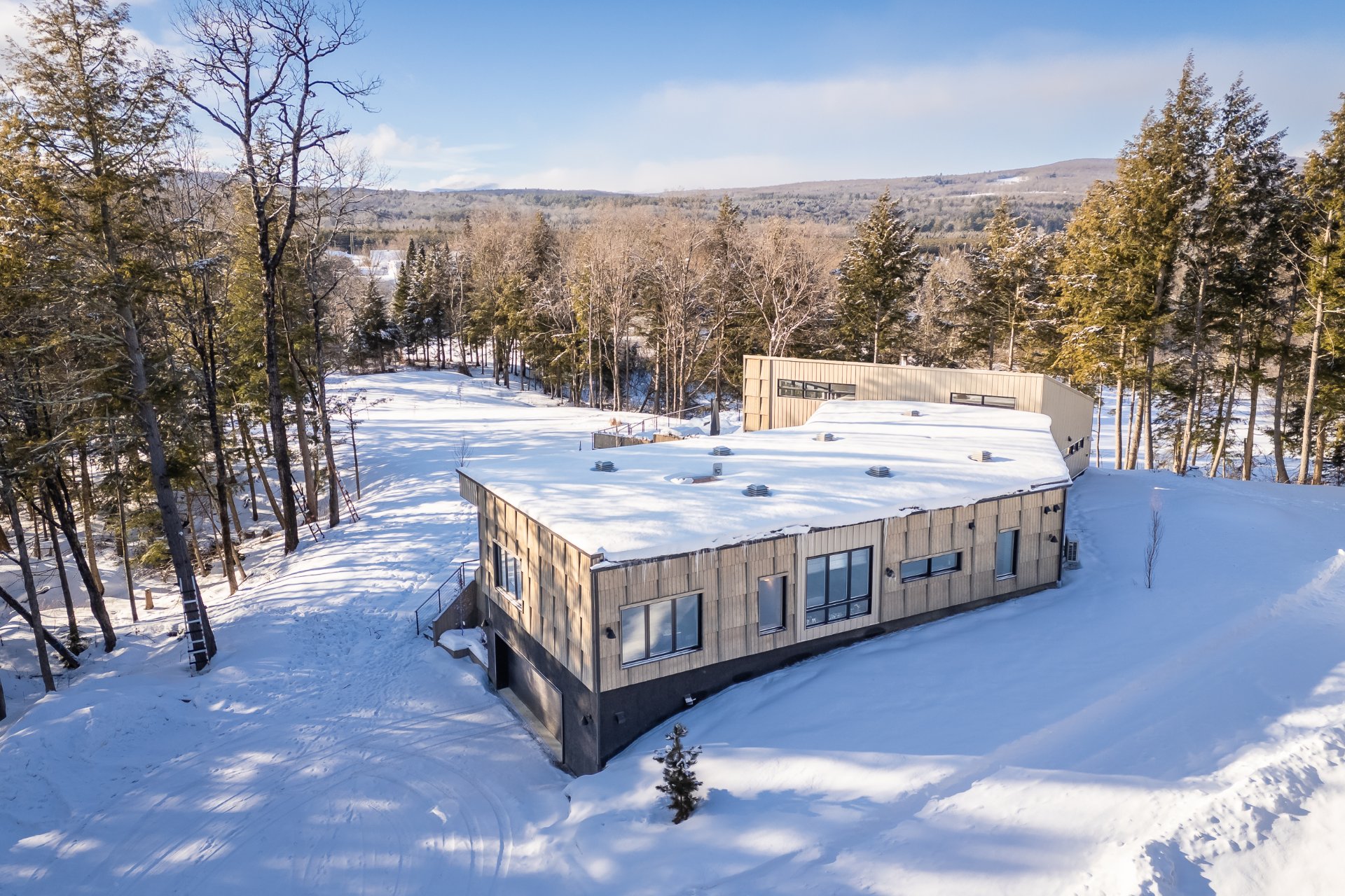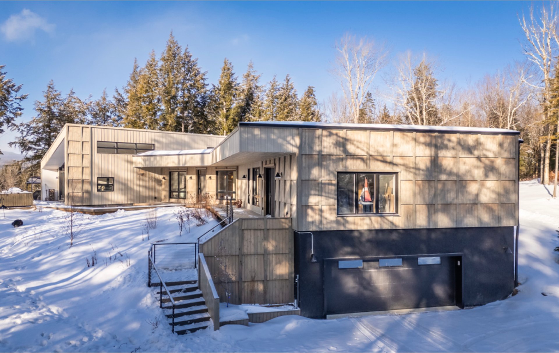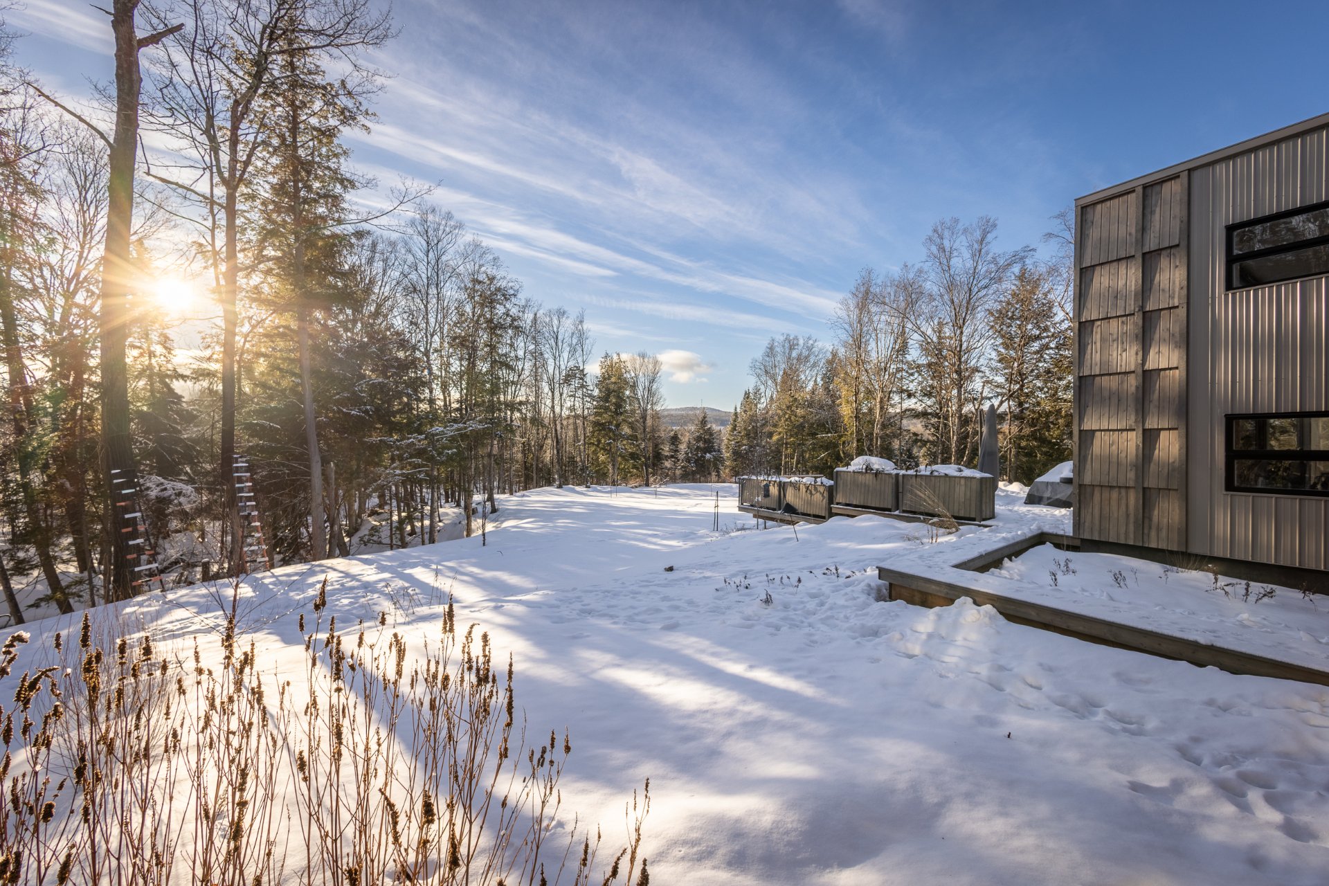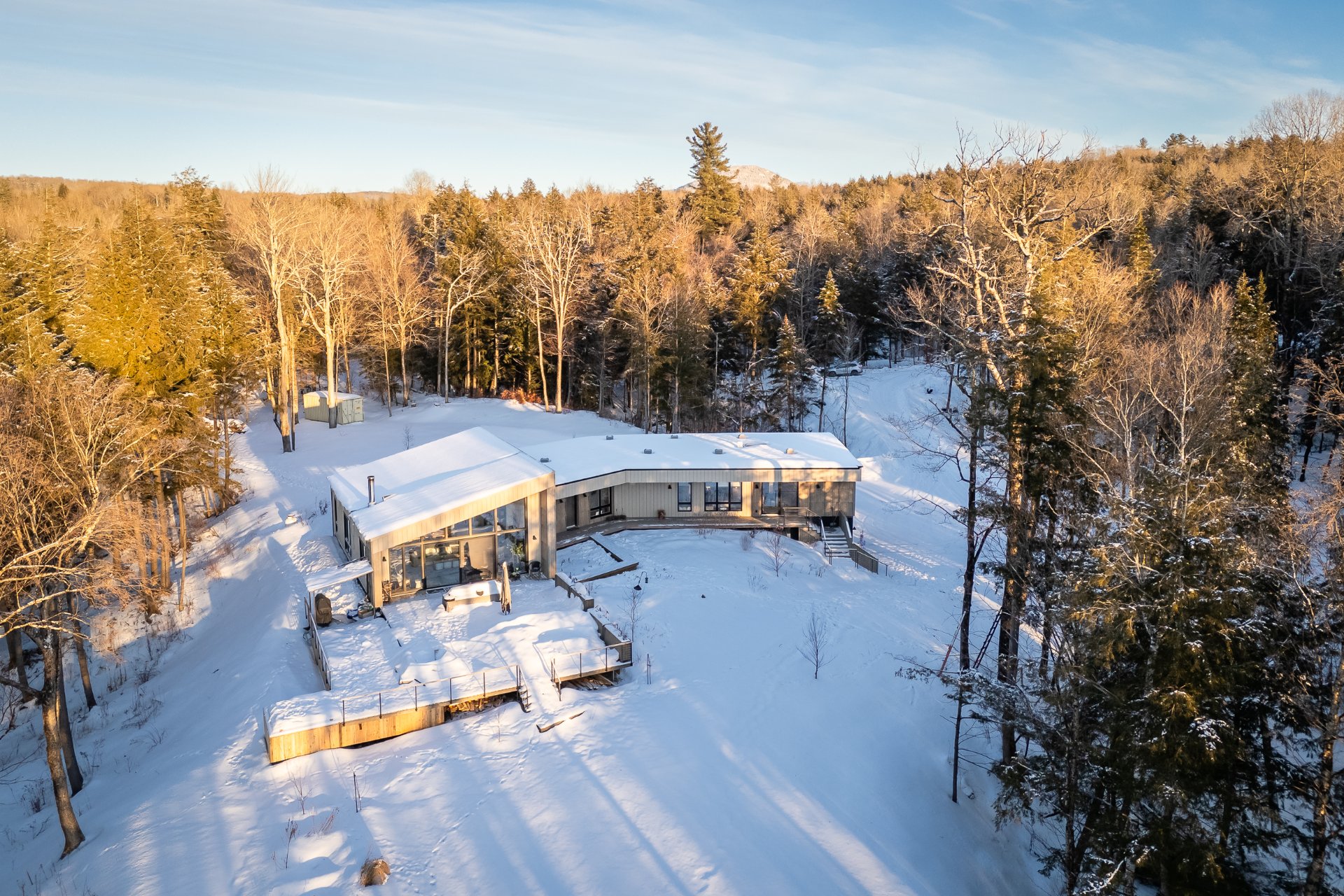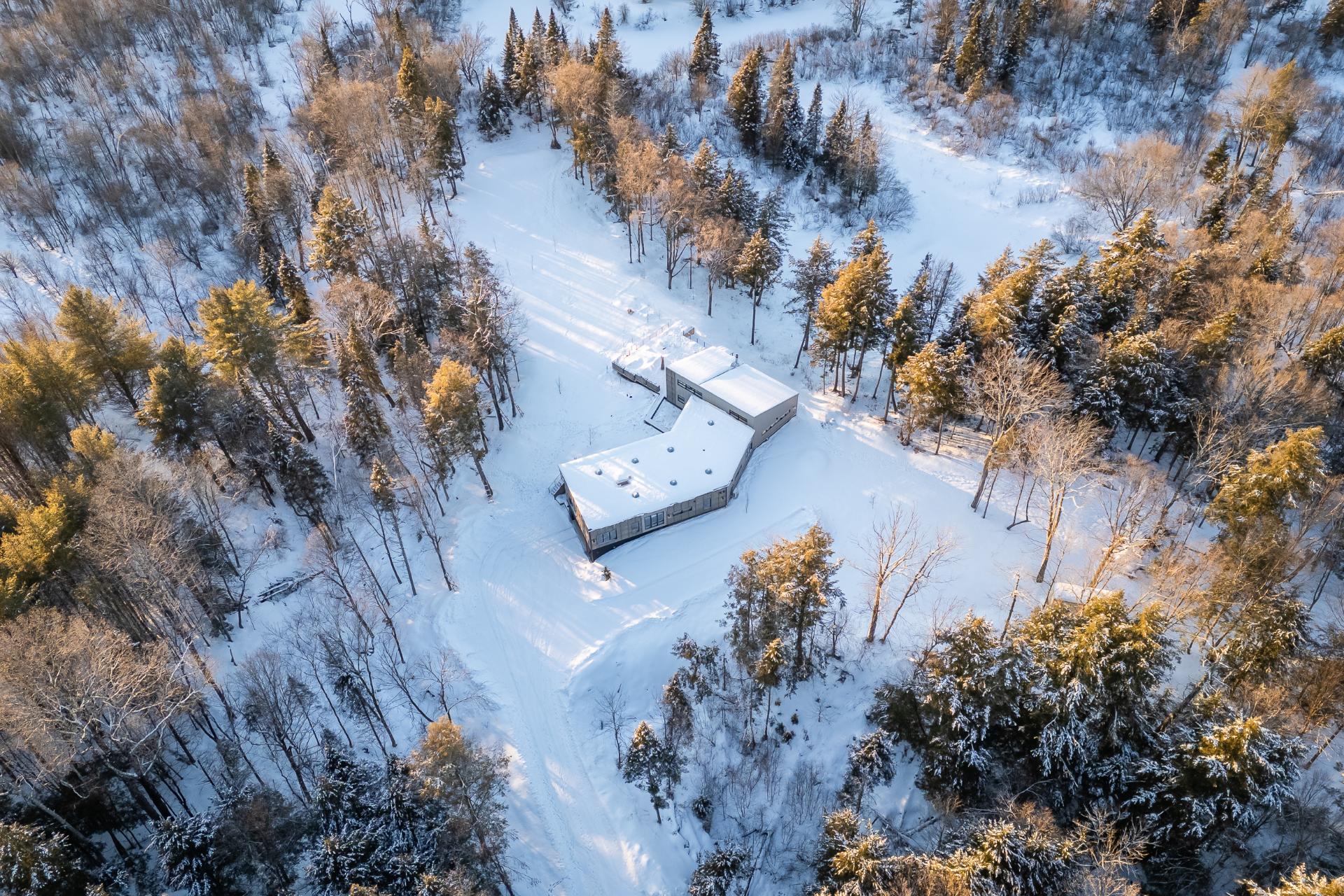 Soigneusement conçue et harmonieusement intégrée à son environnement naturel, cette propriété distinctive offre un équilibre rare entre architecture, paysage et art de vivre. Implantée en retrait le long d'un chemin privé, la maison se dévoile progressivement, ouvrant sur des vues sur les montagnes, l'étang et la rivière Missisquoi. Sa façade en cèdre, inspirée des granges japonaises, marie avec élégance matériaux naturels et industriels. À l'extérieur, une vaste terrasse avec spa, des prairies aménagées et un quai flottant offrent un accès direct à la rivière et des activités en toute saison.
