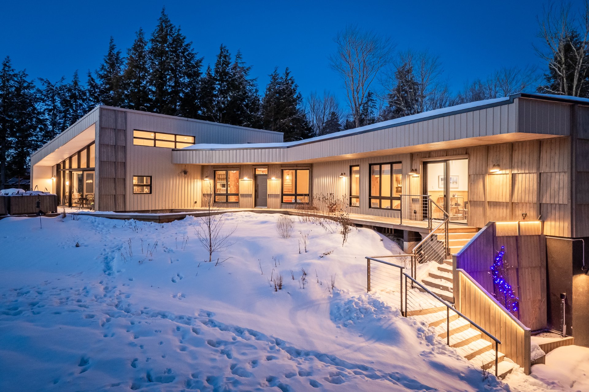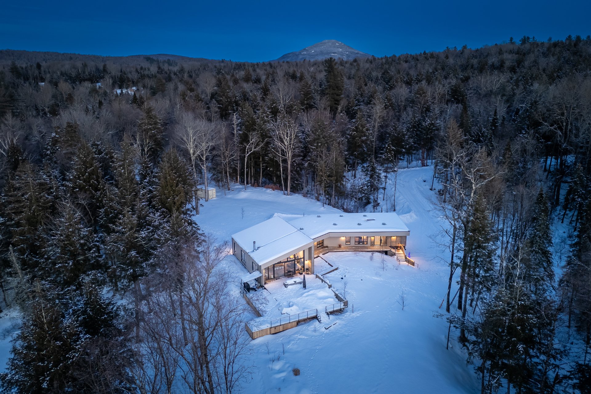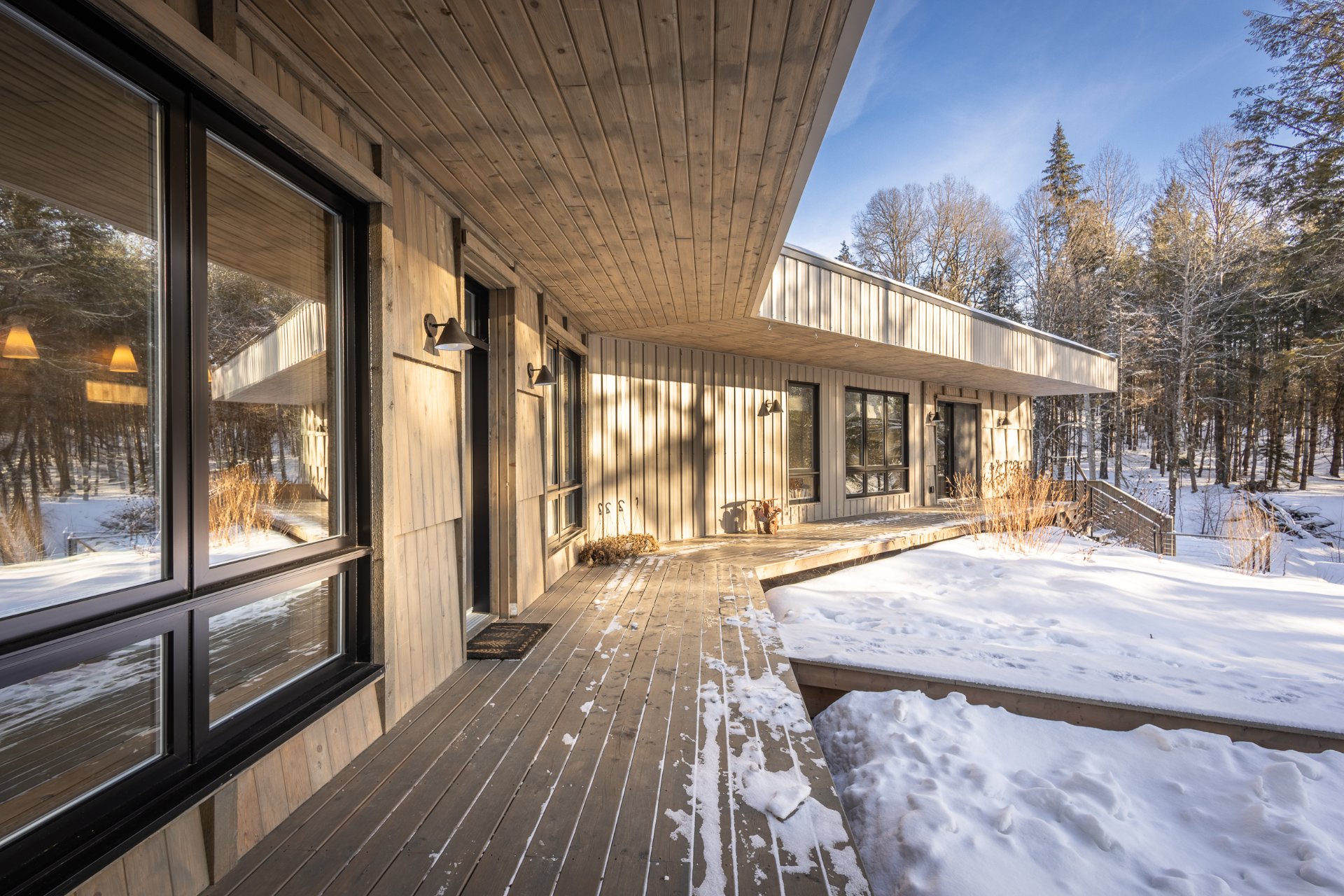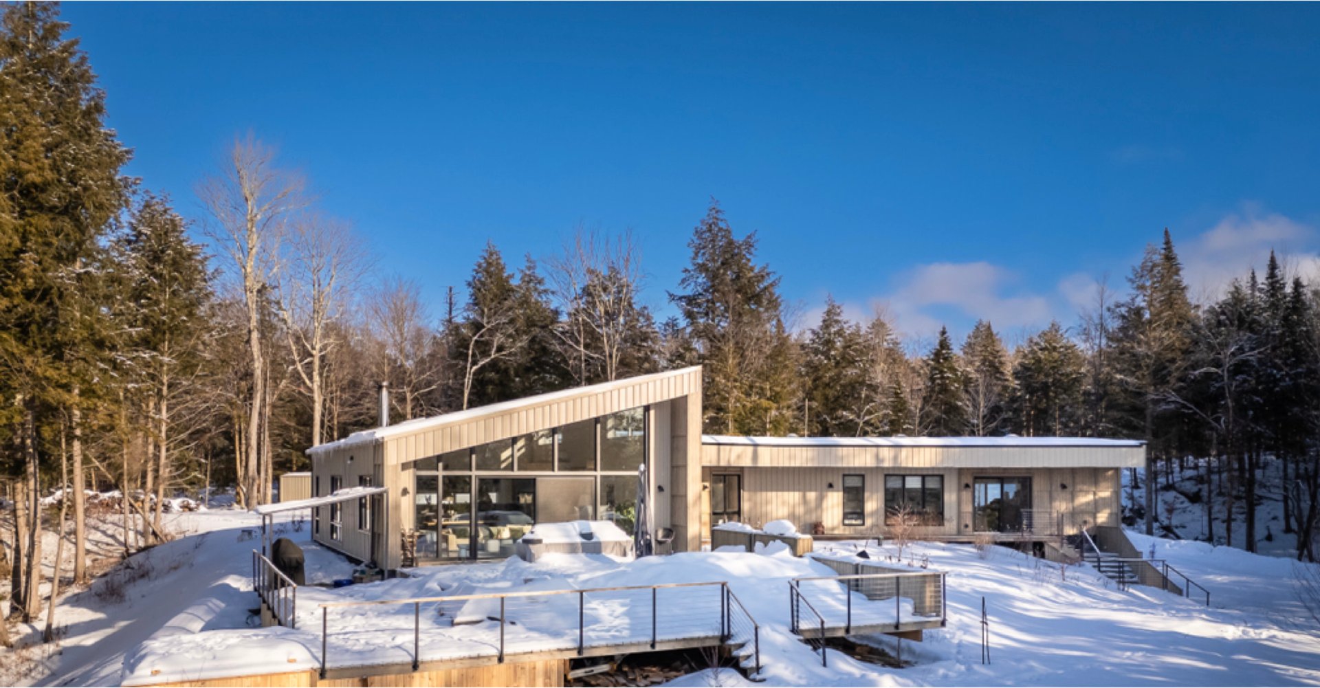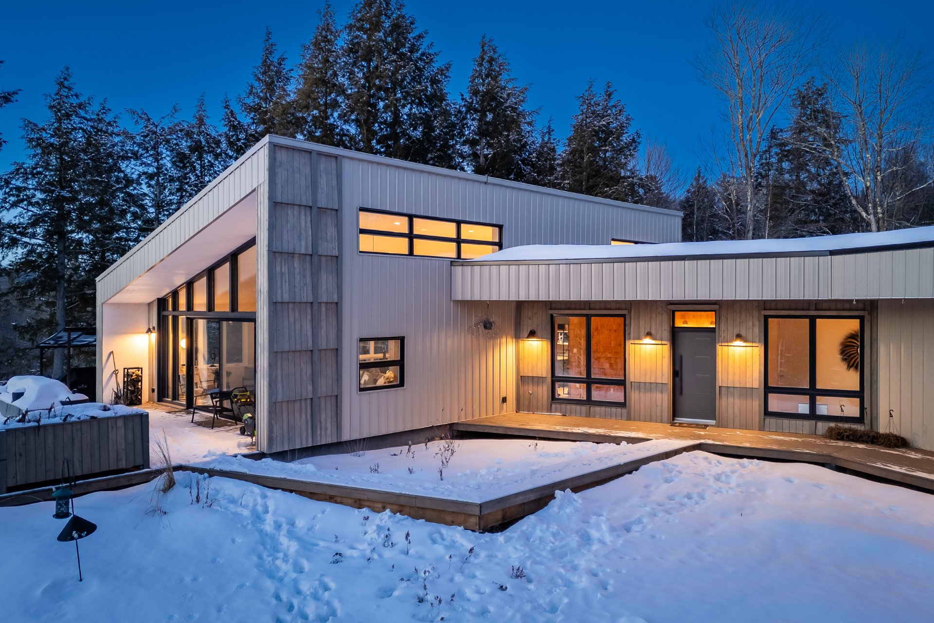 Soigneusement conçue et harmonieusement intégrée à son environnement naturel, cette propriété distinctive offre un équilibre rare entre architecture, paysage et art de vivre. Implantée en retrait le long d'un chemin privé, la maison se dévoile progressivement, ouvrant sur des vues sur les montagnes, l'étang et la rivière Missisquoi. Sa façade en cèdre, inspirée des granges japonaises, marie avec élégance matériaux naturels et industriels. À l'extérieur, une vaste terrasse avec spa, des prairies aménagées et un quai flottant offrent un accès direct à la rivière et des activités en toute saison.