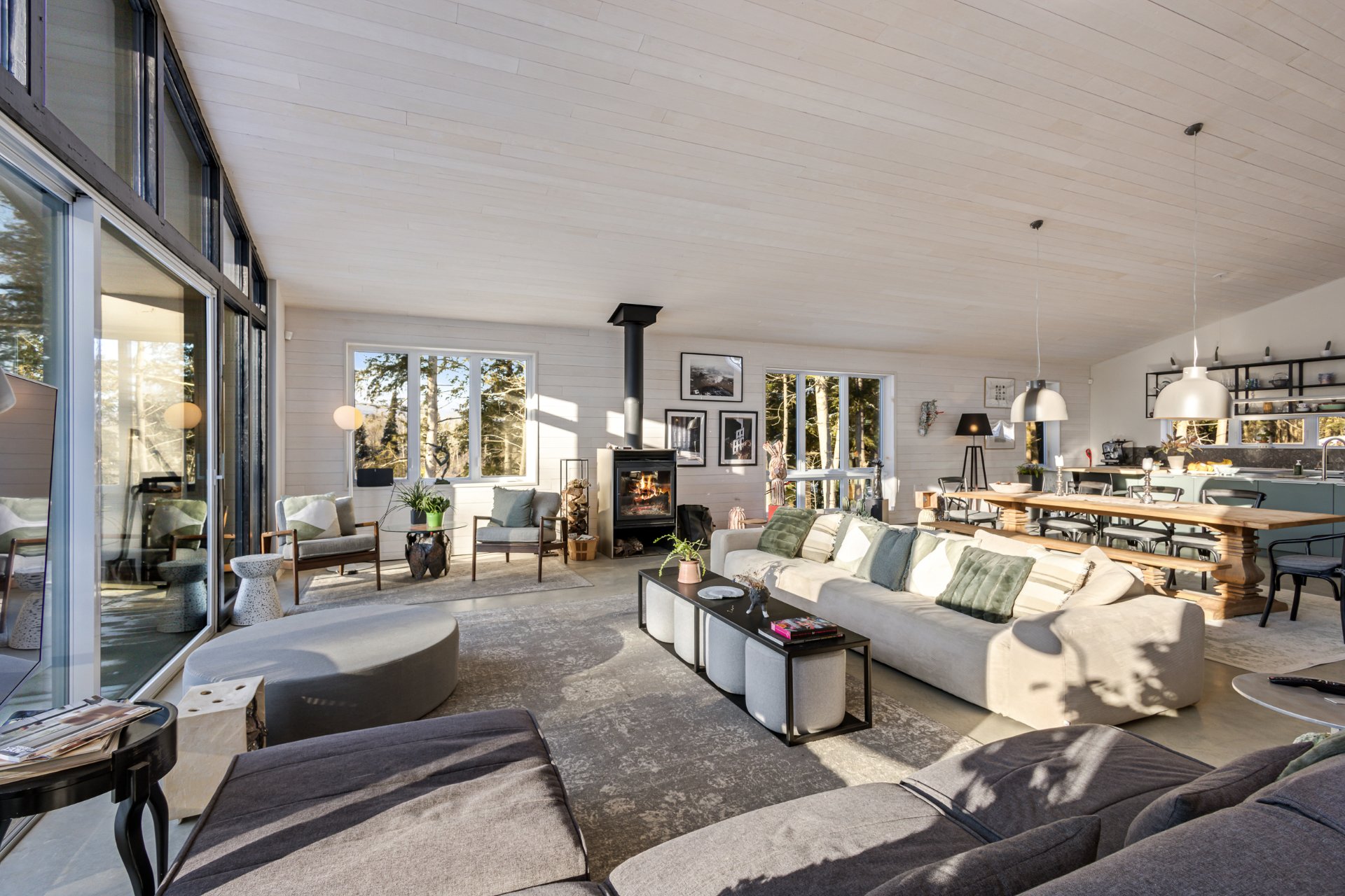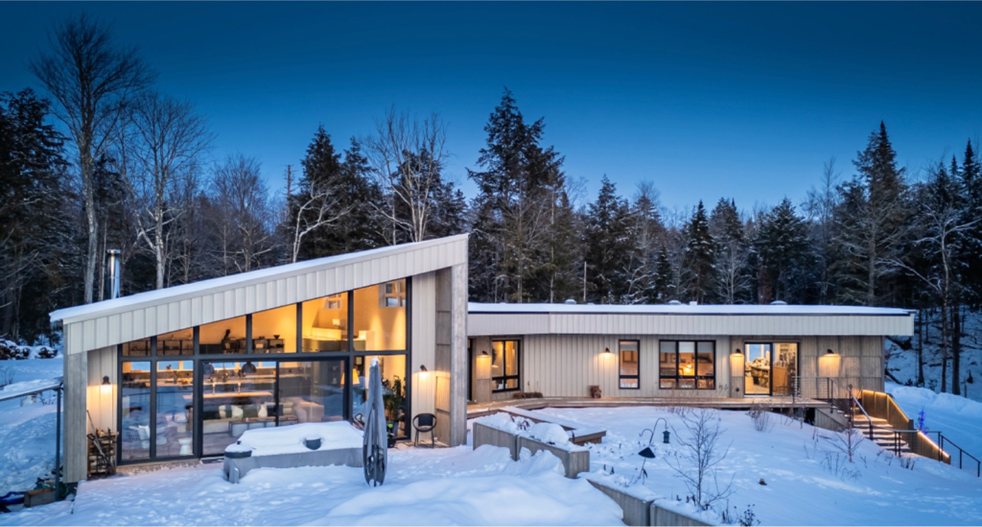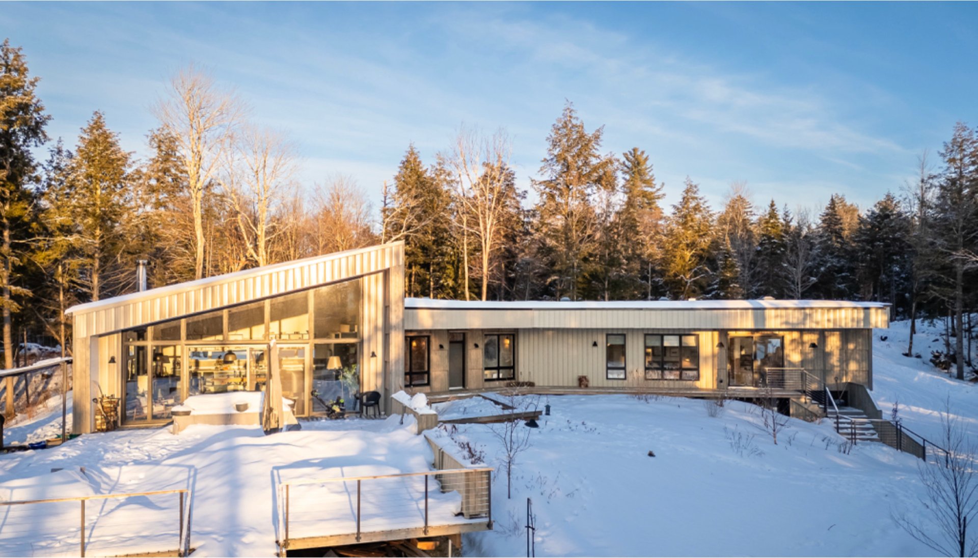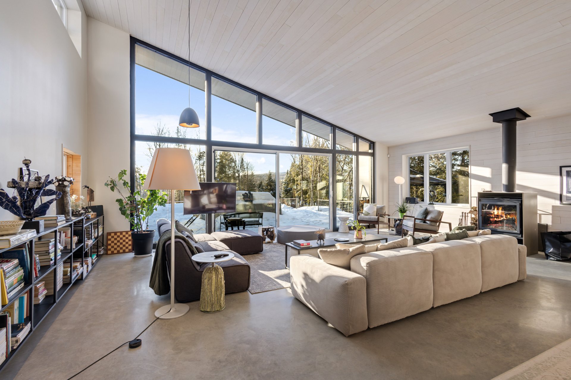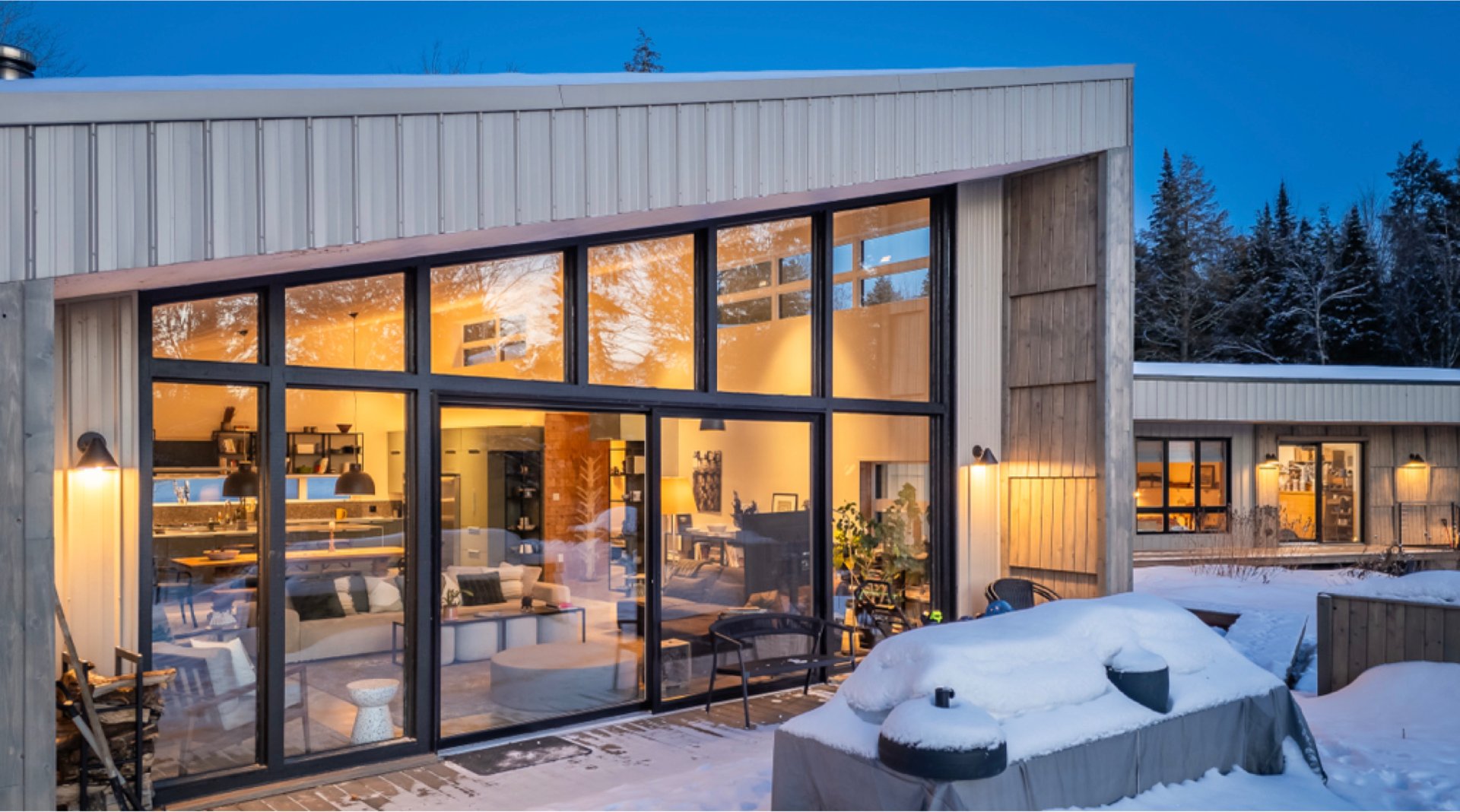 Soigneusement conçue et harmonieusement intégrée à son environnement naturel, cette propriété distinctive offre un équilibre rare entre architecture, paysage et art de vivre. Implantée en retrait le long d'un chemin privé, la maison se dévoile progressivement, ouvrant sur des vues sur les montagnes, l'étang et la rivière Missisquoi. Sa façade en cèdre, inspirée des granges japonaises, marie avec élégance matériaux naturels et industriels. À l'extérieur, une vaste terrasse avec spa, des prairies aménagées et un quai flottant offrent un accès direct à la rivière et des activités en toute saison.